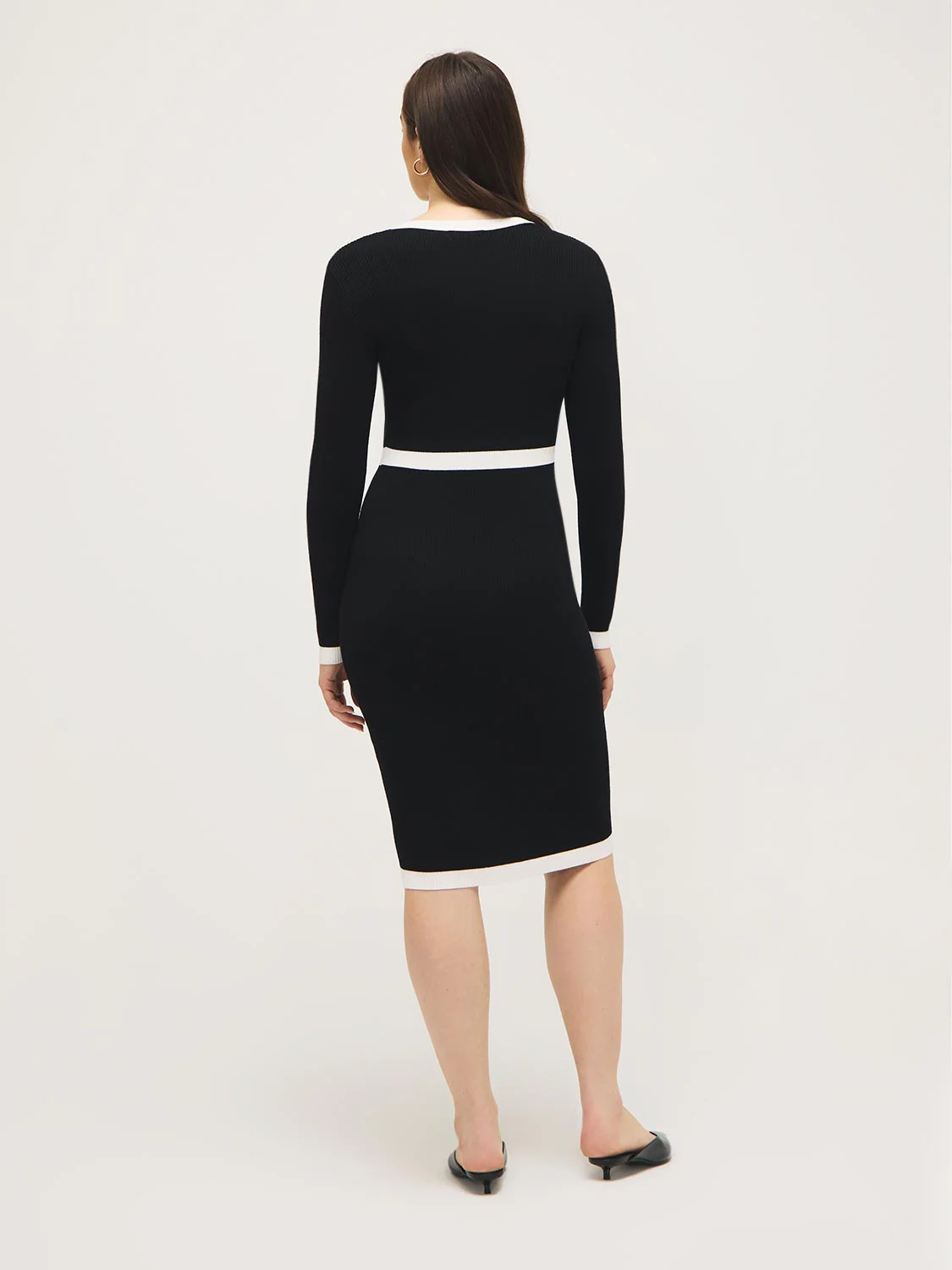 Sleek and refined, this black v-neck midi sweater dress stands out with crisp white contrast trim along the neckline, waist, sleeves, pockets, and hem. The tailored detailing defines the silhouette while adding a modern touch. A versatile piece you can wear to work, dinner, or an evening out; just add heels or boots to complete the look.