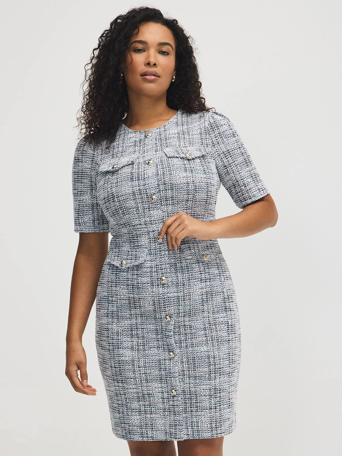 Classy, flattering, and professionally chic, this button-front boucle sheath dress is perfect for workdays, evenings, and everything in between.