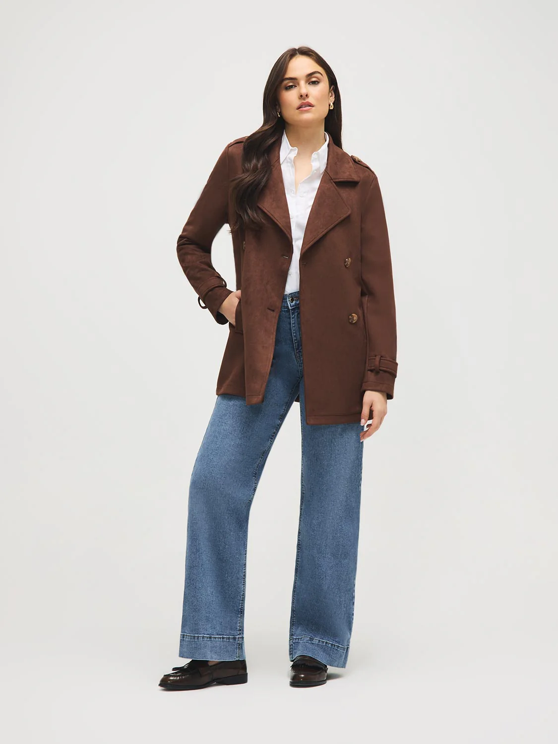 Classic trench styling gets a luxe update in this faux suede coat. The soft, supple fabric brings a rich texture to the timeless silhouette, complete with a belted waist for a flattering shape. An easy way to elevate everyday outfits, it layers beautifully over everything from denim to dresses.Knit trench coat Faux suede Double breasted Unlined Model is wearing size XS Fabric: 95% polyester, 5% spandex Clean with damp cloth Hang to dry