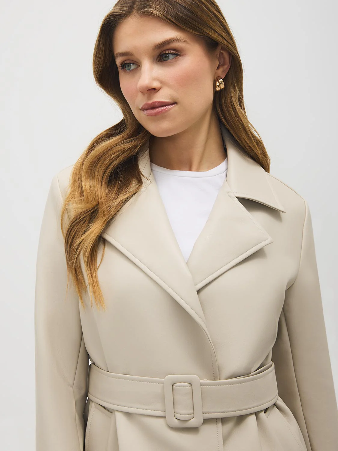 A sleek take on a classic, this mid-length trench coat is crafted from smooth faux leather for a modern edge. The belted waist cinches the silhouette, while classic trench details keep it timeless. Perfect for layering over everything from workwear to weekend outfits, it's the statement coat you'll reach for season after season.