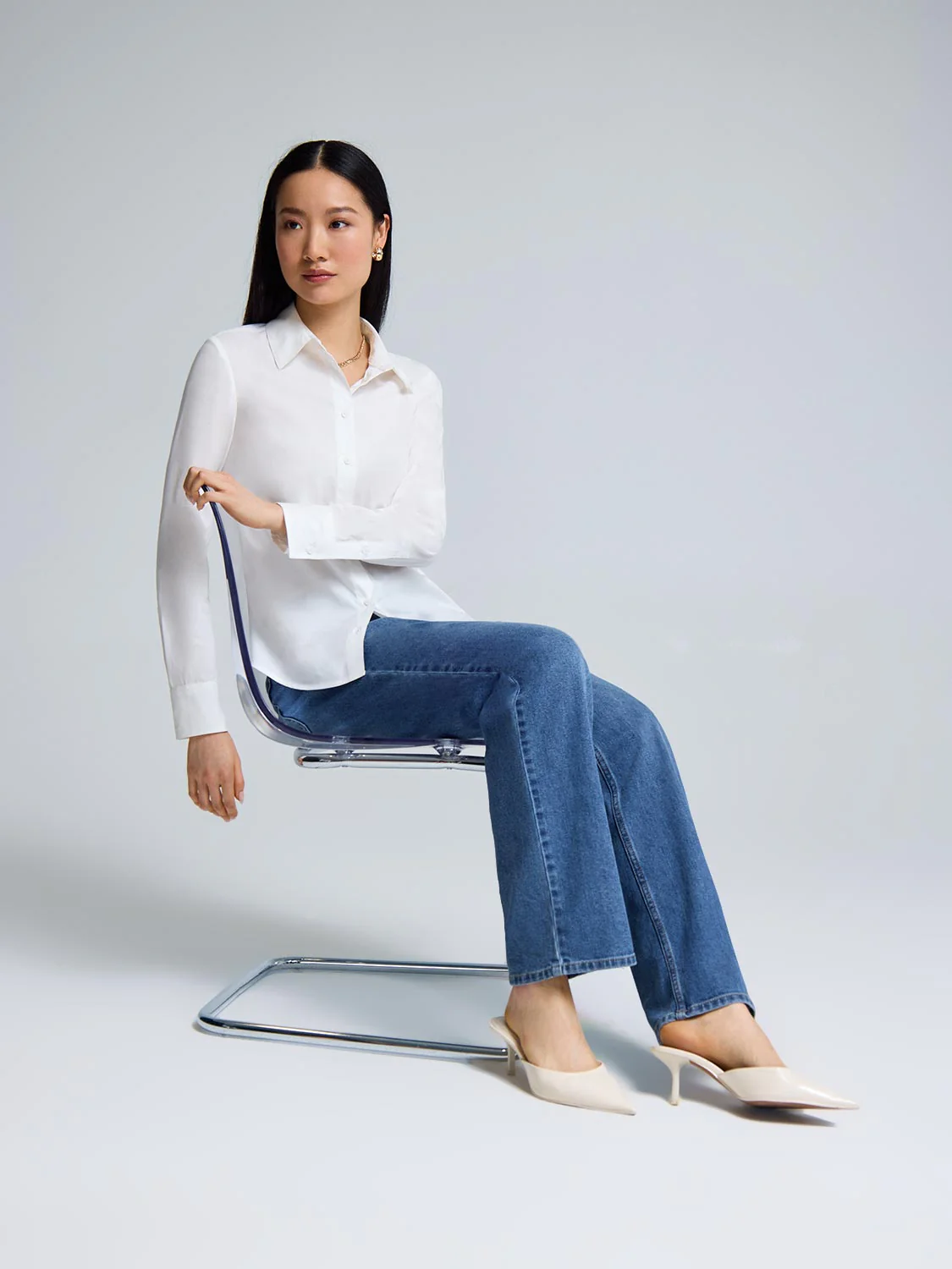 Crisp, breathable, and endlessly versatile, this cotton button-up blouse is a wardrobe classic made for effortless styling.Woven blouse Shirt collar and cuff Button-up front Back and bust darts Long sleeve Exposed placket Regular fit Minimal stretch Model is wearing size XS Fabric: 68% cotton, 28% nylon, 4% spandex Machine wash inside out in cold water Hang to dry