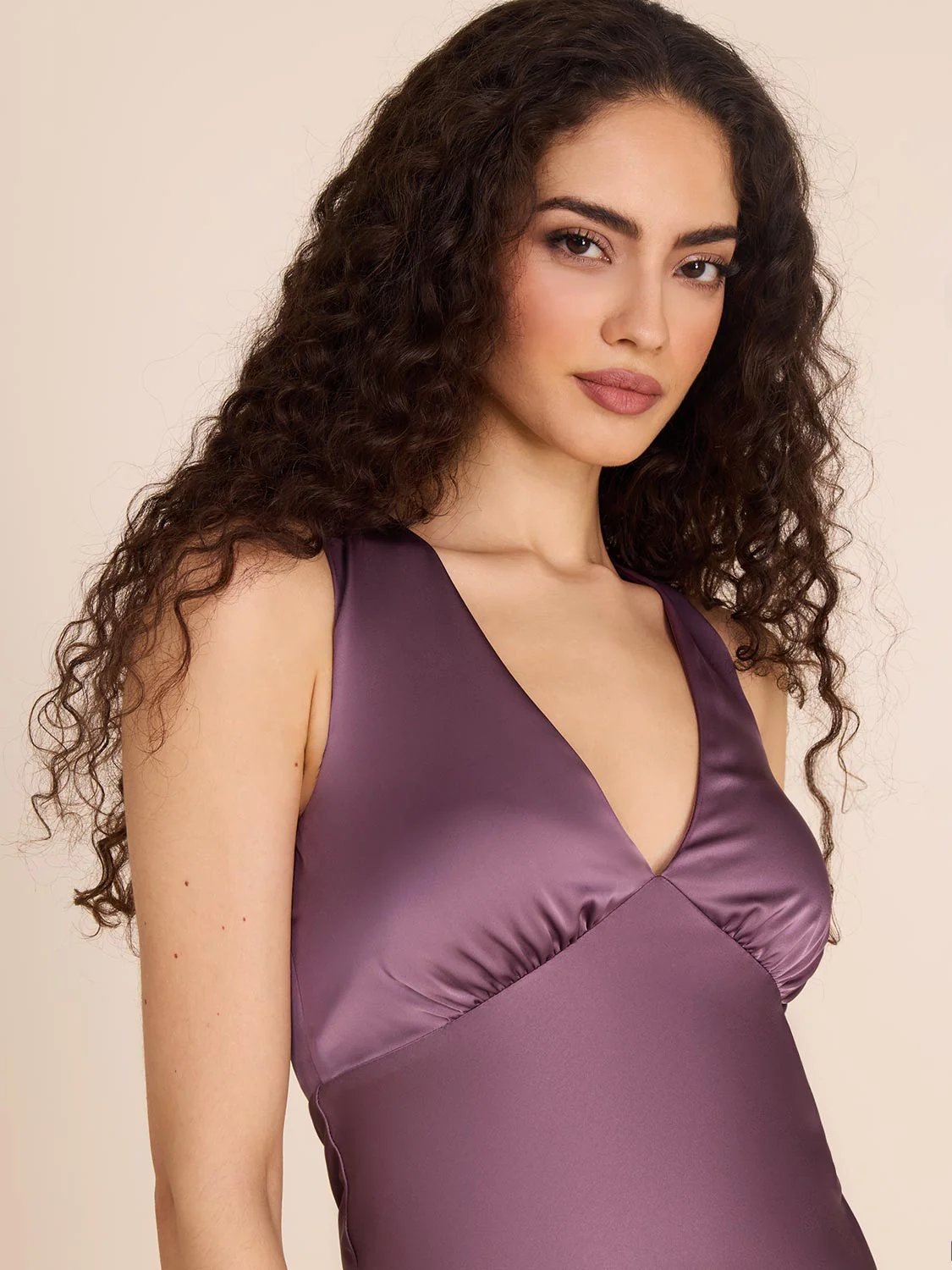 Sleek satin-like fabric, a flattering V-neckline, and a draped cowl back create a look that's equal parts effortless and alluring. Ideal for all occasions, pair this midi with a pair of strappy heels, a jewelled clutch, and diamond necklace to complete the look.