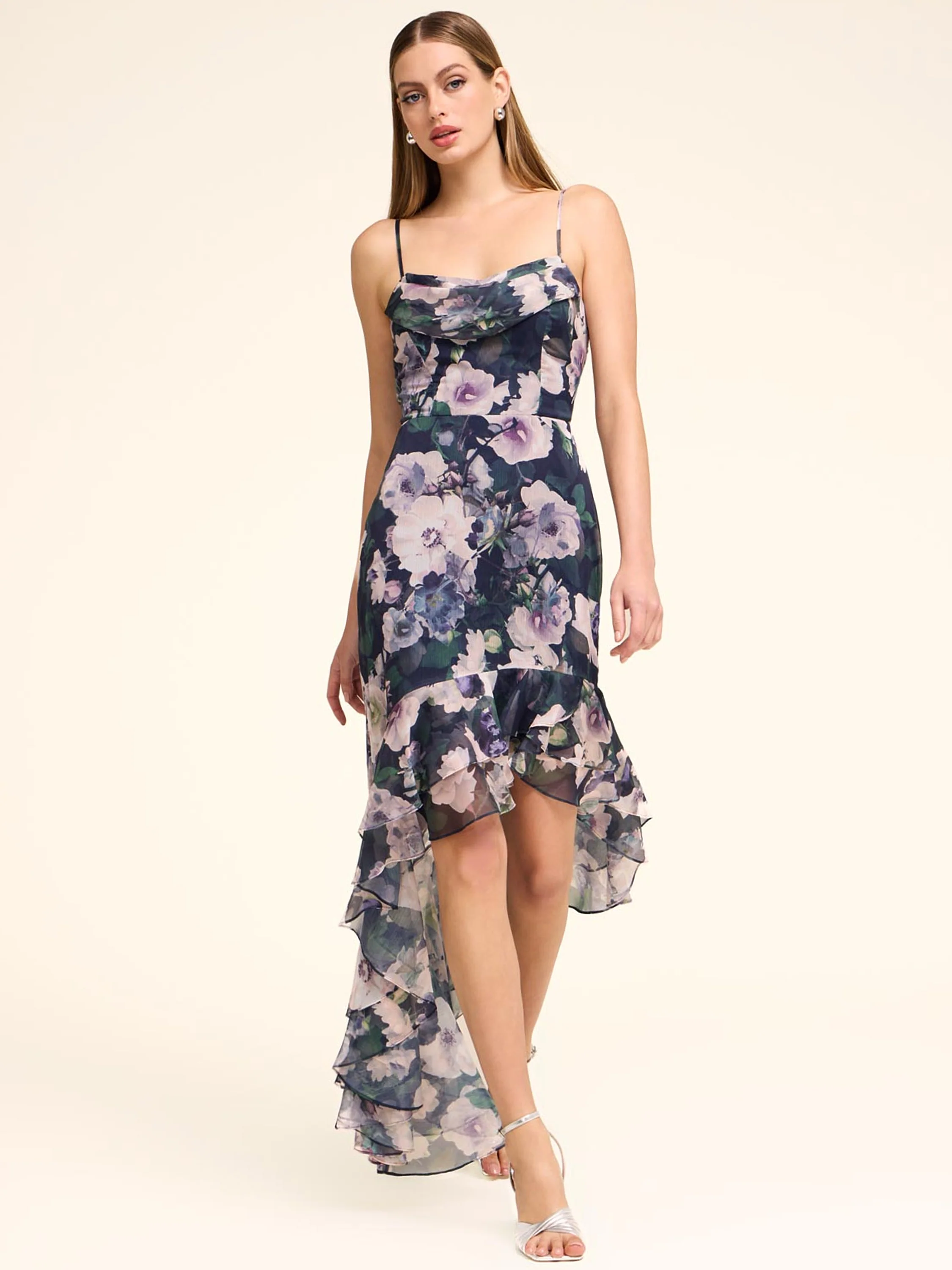 Soft florals meet a modern edge with an asymmetrical ruffle hem designed for effortless movement and standout style. It makes the perfect romantic date night outfit, party dress for a girl's night out, or for elegant wedding ceremonies.